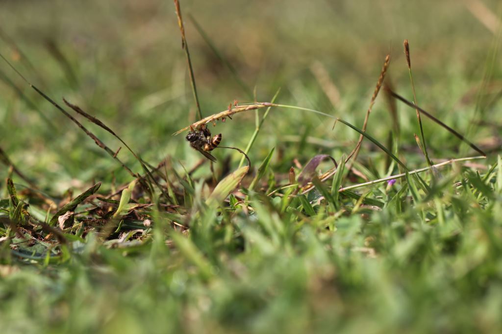 a bee was feeding and playing with the flower stalks.