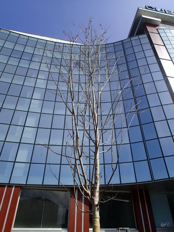 The tree in urbanized confinement... with no chance of removing itself to some more natural ambient. How long will it be able to endure the reflected glare off the building windows, nobody knows. Cruel destiny. Photo by: