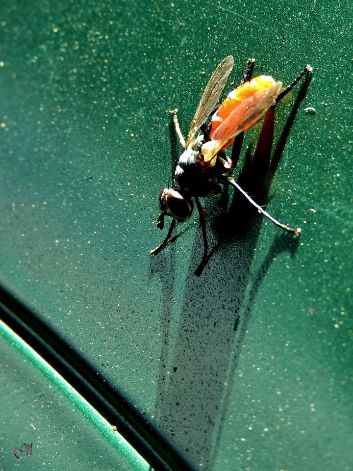 A colorful bug sunbathing on the garden chair. The close-up shows how much dust has been added to it during the last night... Photo by: