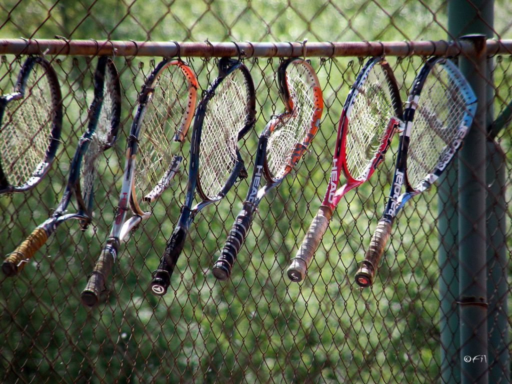 Tennis court fence decorated with broken recketts, as if their frustrated owners left us a message, like we have changed this sport for a more peaceful activity... Photo by: