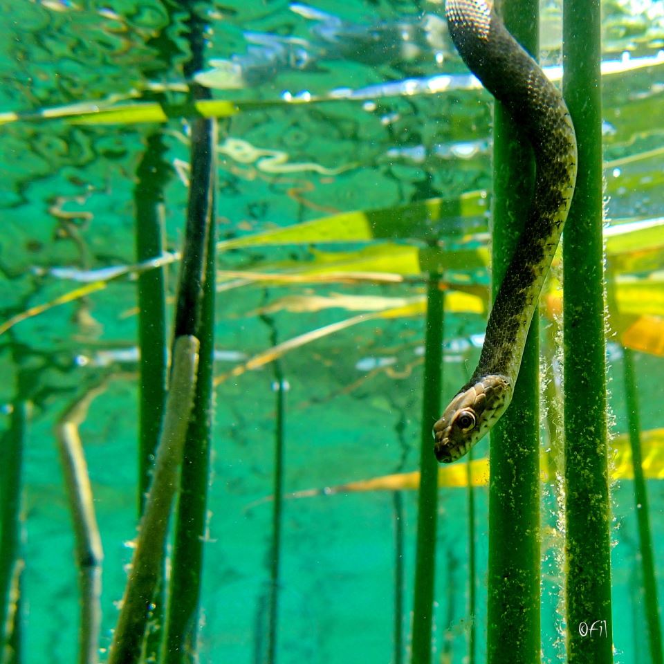 Sometimes I look just under the surface, and the snakes are on the bottom. The other times, Ill scan the bottom, and one will appear from above the water to see me. Funny souls, the watersnakes! :) Photo by: