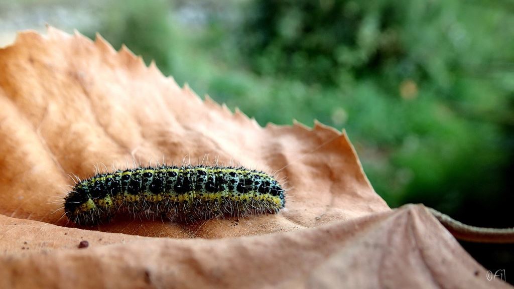 A nice caterpillar slowly traveling across dead leaf - slow enough to let me take several photos. I wonder what kind of an insect will metamorph out of it... but itll probably have to wait until Spring! Photo by: