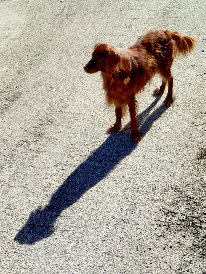 She casts a pretty shadow doesnt she? Our Irish setter likes to go out after every meal, and wait for some car to run along, and bark at the wheels. :) Photo by: