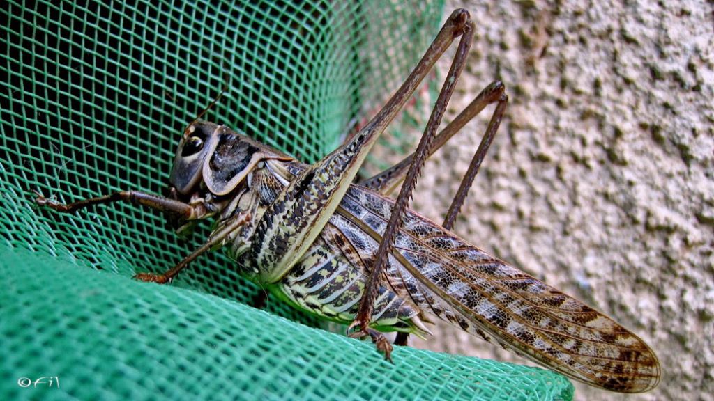 The grasshopper landed on the netting by the windowsill, and stayed there long enough to award me with this view. Enjoy! :) Photo by: