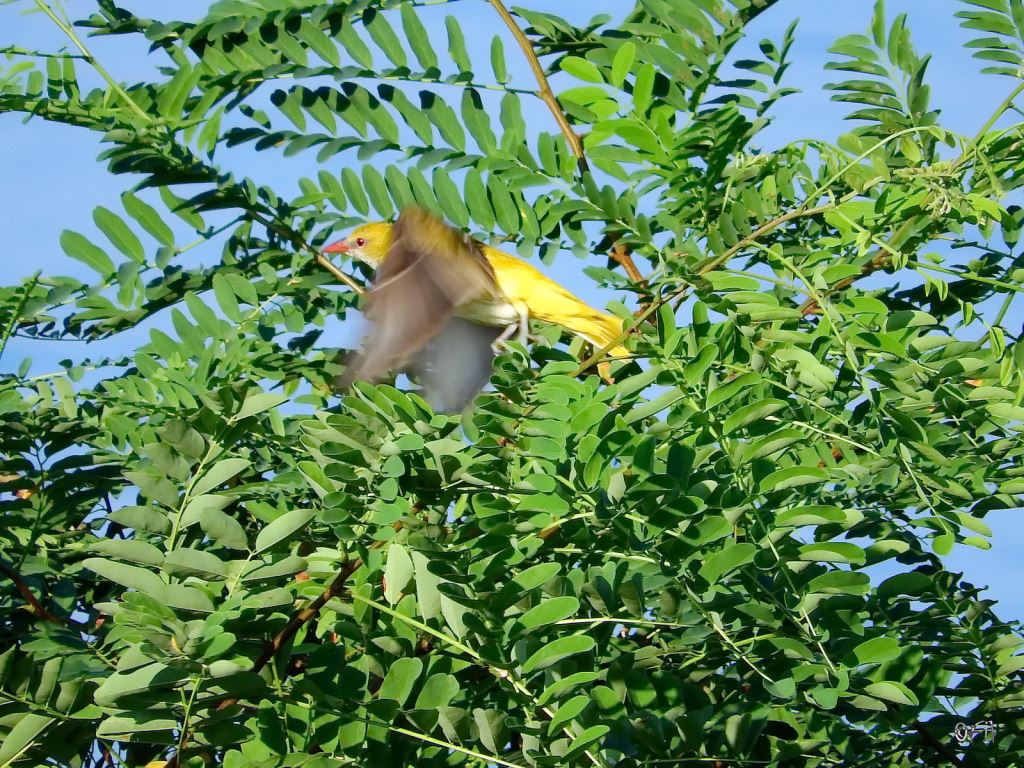 (Oriolus oriolus), pretty rare in our surroundings, photographed at the very moment it tried to fly away.