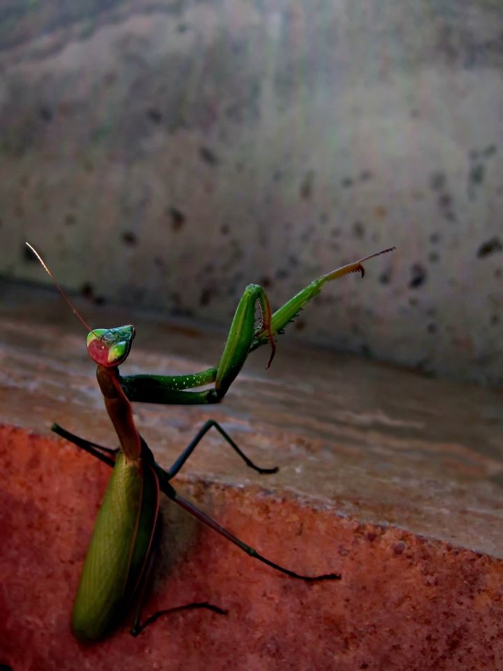 Praying mantis was actually fighting to lose a sticky gossamer thread that held him fixed to the wall. When I cut it for him, he remained sitting, quite unafraid, just a few inches further. Interesting color, isnt he? Photo by: