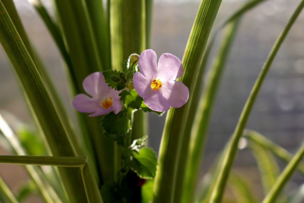 Tiny purple wildflowers in a planter with yucca leaves. Photo by: