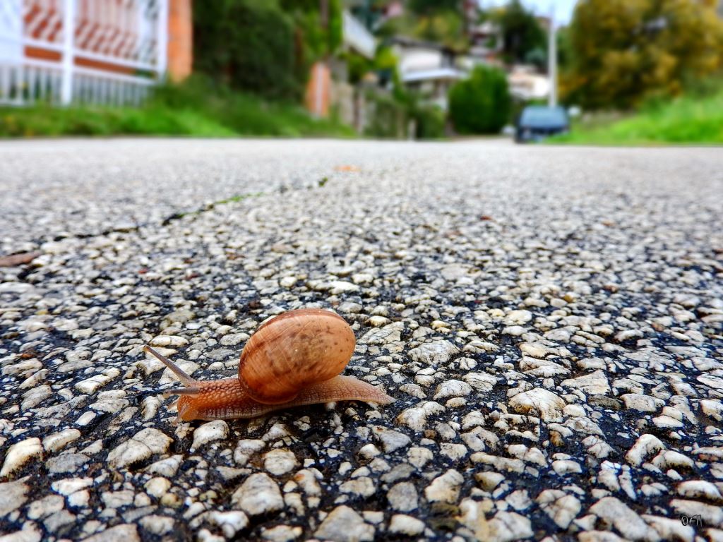 For small, slow beings it is sometimes a serious enterprise to try and cross the road. This snail was lucky; after the photo session, I put him safely into the grass on the other side. Photo by: