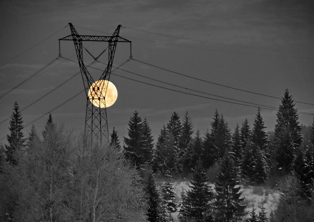 A coincidental silhouetting of the power pylon over the full Moon spotted during a night driving in Croatian mountain region, selectively turned into partial B&W. Photo by: