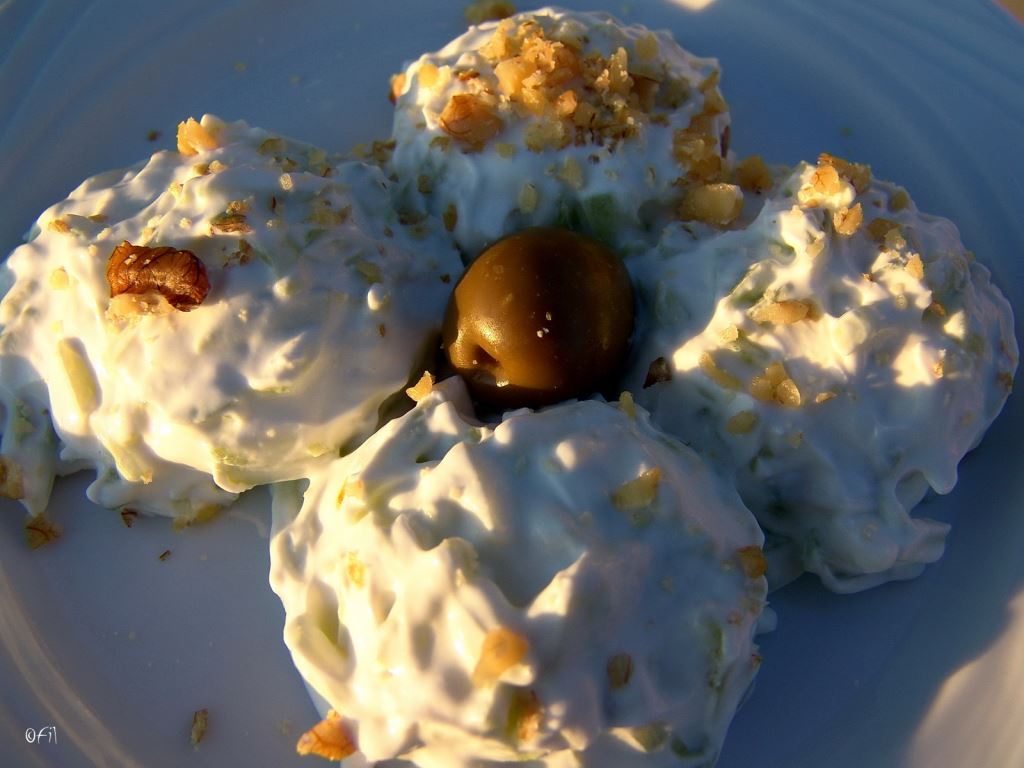 Local meal made of sour cream finely cut fresh cucumbers, and either sesame seed or ground nuts... with an olive for decoration. Very refreshing, especially during warm seasons. Photo by: