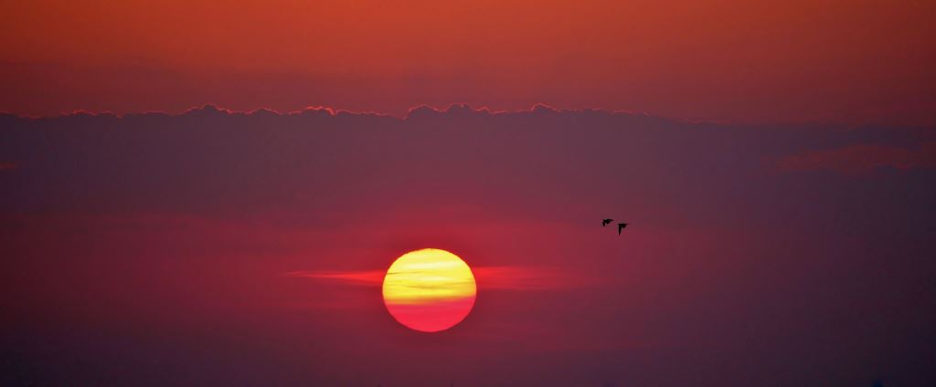 Two eagles are silhouetted against a purple sky at sunset. Photo by: