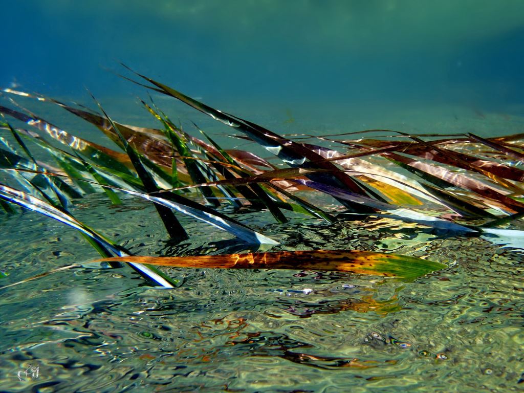 Aging and seasonal winds make the reedstalks bow and their leaves sink under the lake surface.