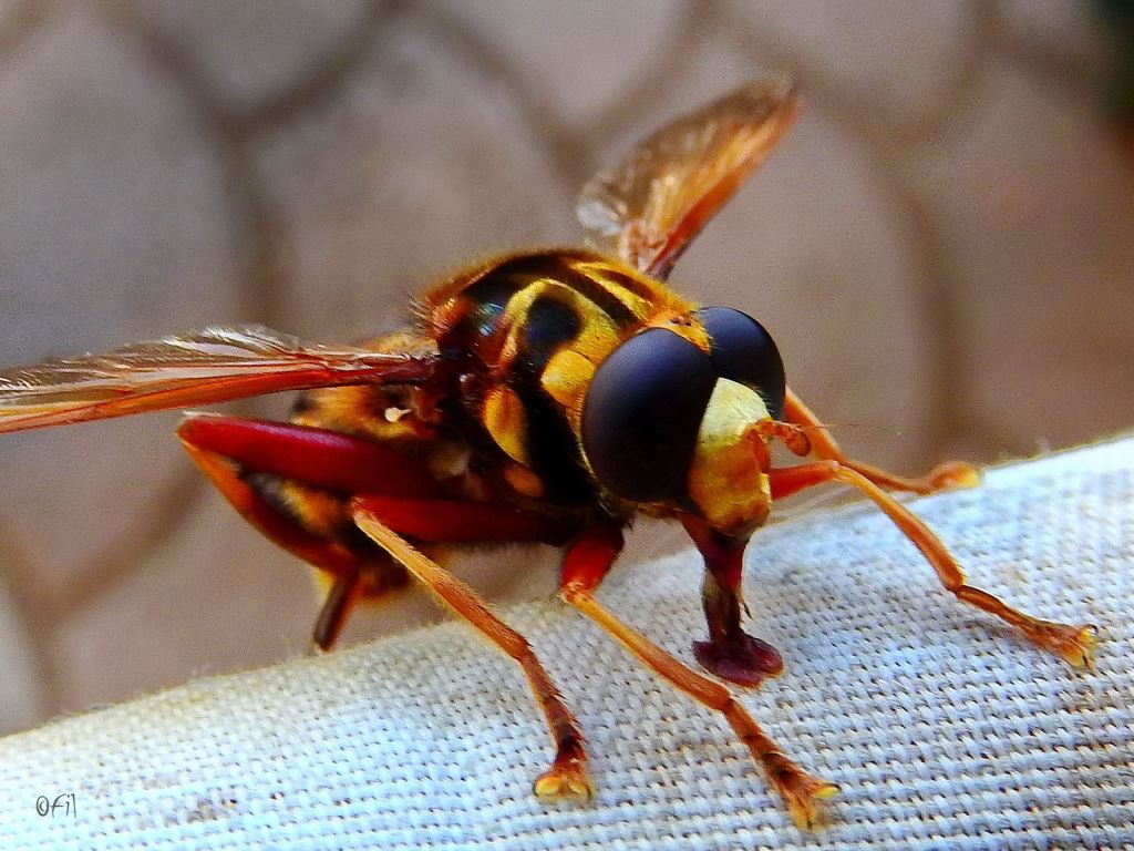 Main difference to notice at a glance is the eyes and the way it hovers in place, unlike normal wasps. On closer observation youll also notice its trunk where wasps have pincer-like mouth... hinting at the mode of feeding. Photo by: