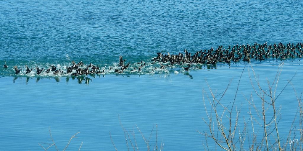 Coots in their mating ritual. The flock is jamming closely together, and then suddenly theyll run like there was something scaring them off. Funny birds, coots! Photo by: