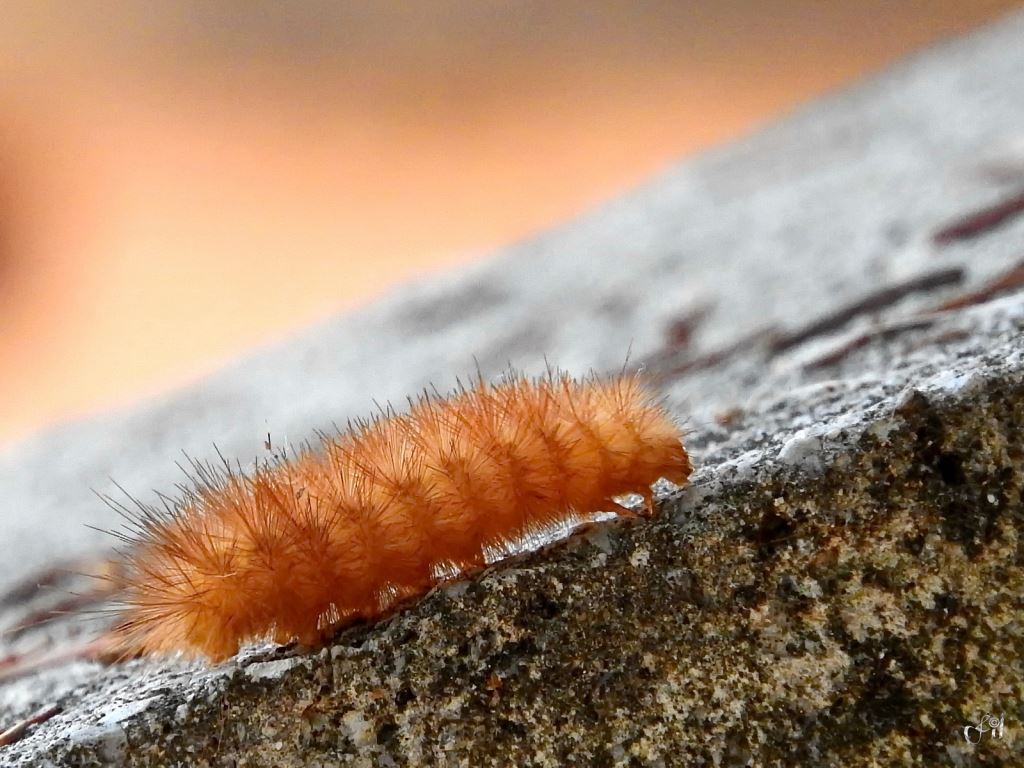 "Caterpillar c.1440, catyrpel, probably altered (by association with M.E. piller "plunderer") from Norm.-Fr. caterpilose, from O.Fr. chatepelose, literally "hairy cat" (probably in reference to the "wooly-bear" variety), from L.L. catta "cat" + pilosus "hair." A Swiss German name for it is teufelskatz "devils cat." (Thesaurus) Photo by: